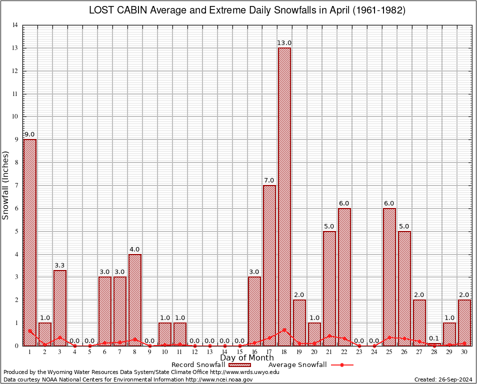 April Average and Extreme Daily Snowfall AMounts (1961-1982)
