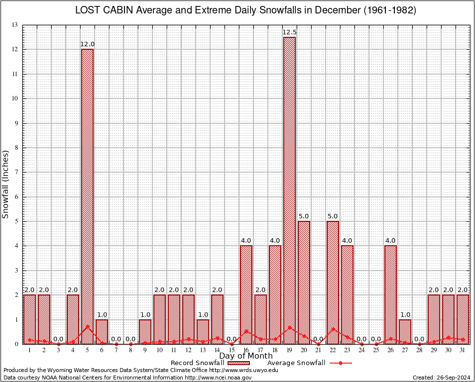 LOST CABIN (485734) December Average and Extreme Daily Snowfall AMounts (1961-1982) To index page for LOST CABIN