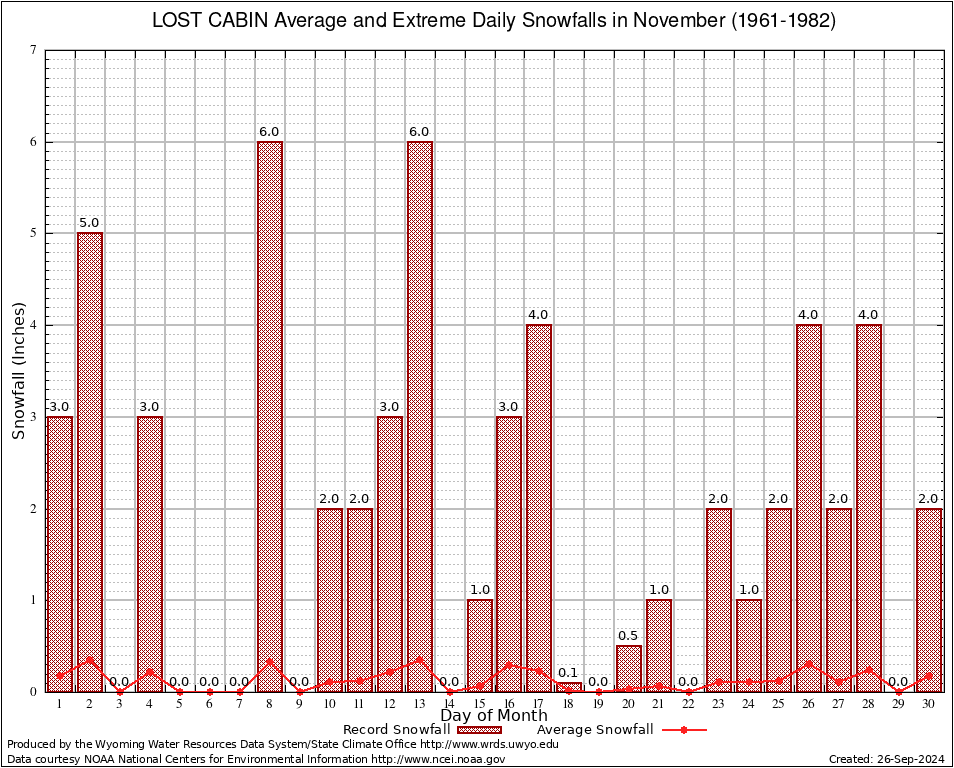 LOST CABIN (485734) November Average and Extreme Daily Snowfall AMounts (1961-1982) To index page for LOST CABIN