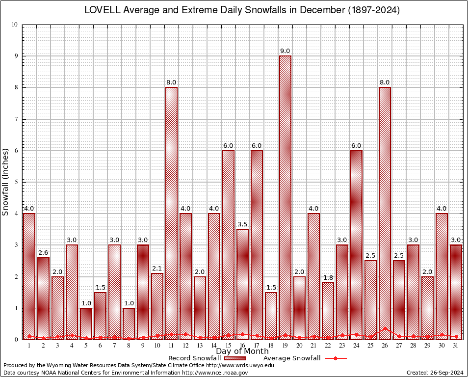 LOVELL (485770) December Average and Extreme Daily Snowfall AMounts (1897-2024) To index page for LOVELL