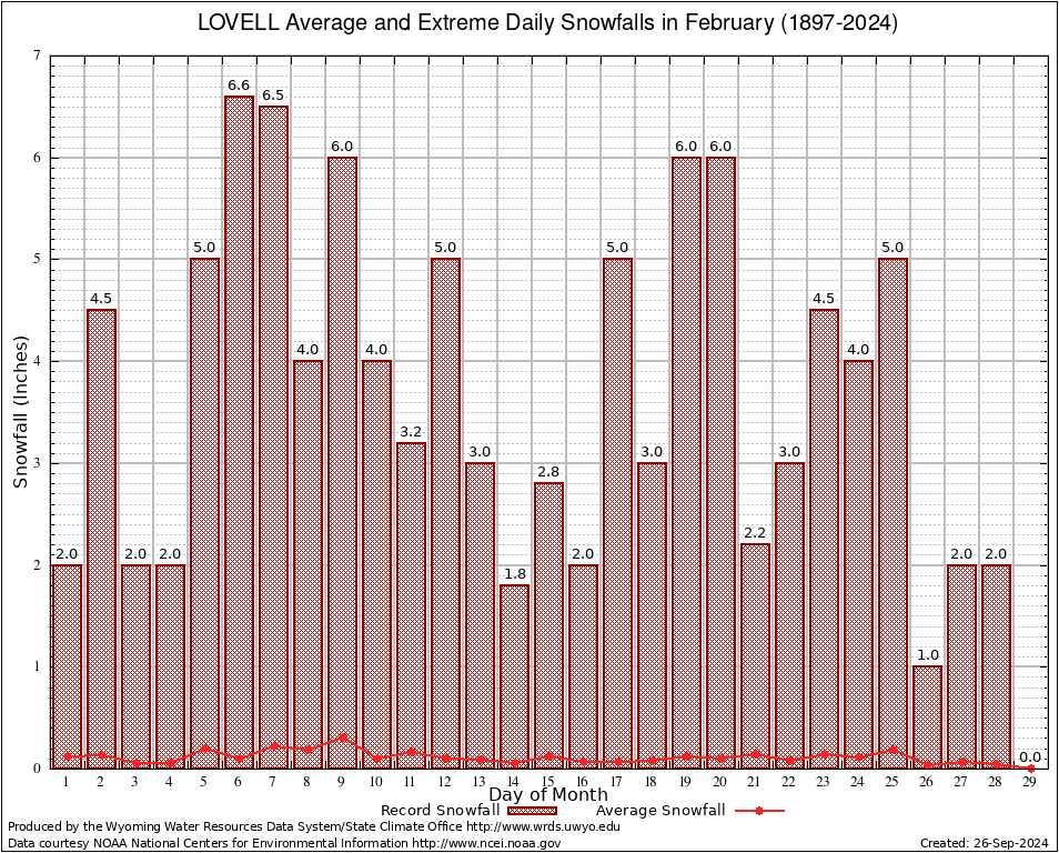 LOVELL (485770) February Average and Extreme Daily Snowfall AMounts (1897-2024) To index page for LOVELL