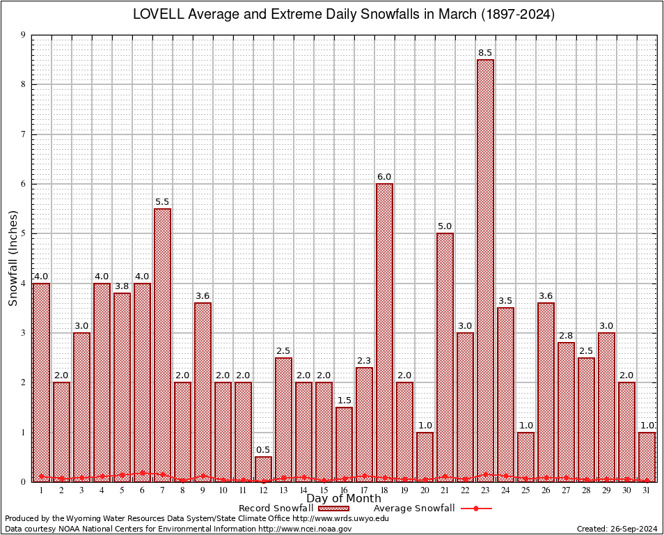 LOVELL (485770) March Average and Extreme Daily Snowfall AMounts (1897-2024) To index page for LOVELL