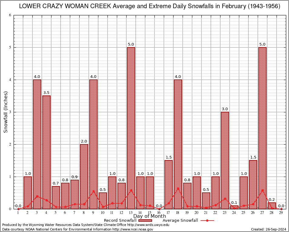 February Average and Extreme Daily Snowfall AMounts (1943-1956)