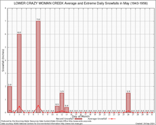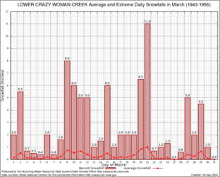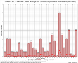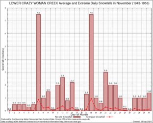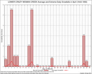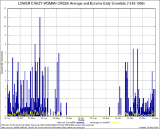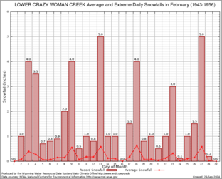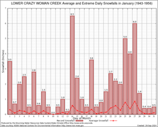 LOWER CRAZY WOMAN CREEK (485780) Record Extreme and Average Daily Snowfall (1943-1956) See Here for Other Stations
