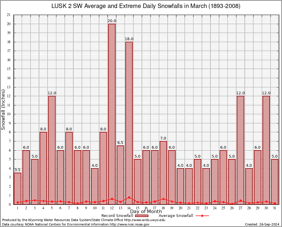 March Average and Extreme Daily Snowfall AMounts (1893-2008)