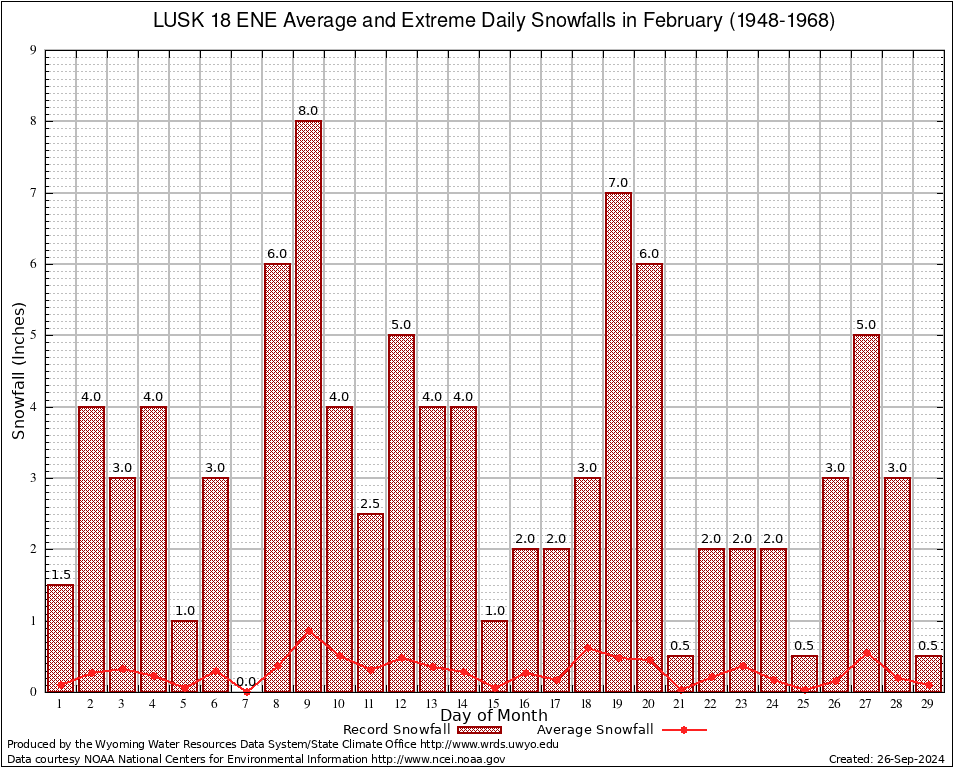 February Average and Extreme Daily Snowfall AMounts (1948-1968)