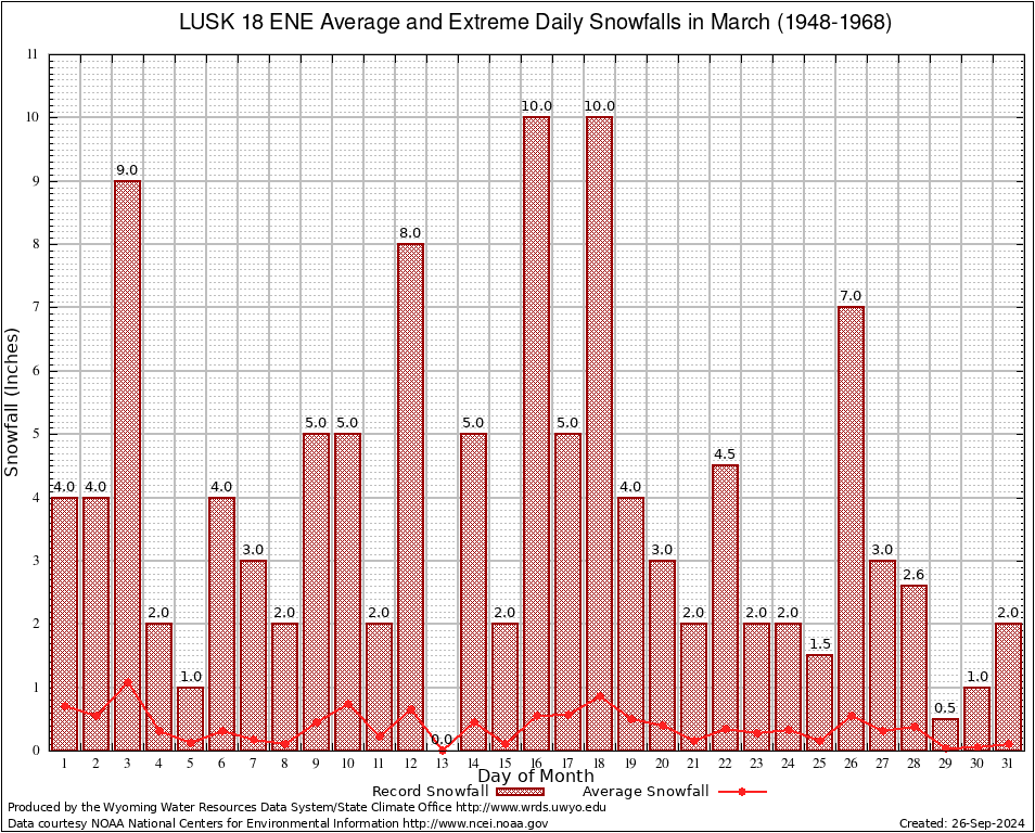 March Average and Extreme Daily Snowfall AMounts (1948-1968)