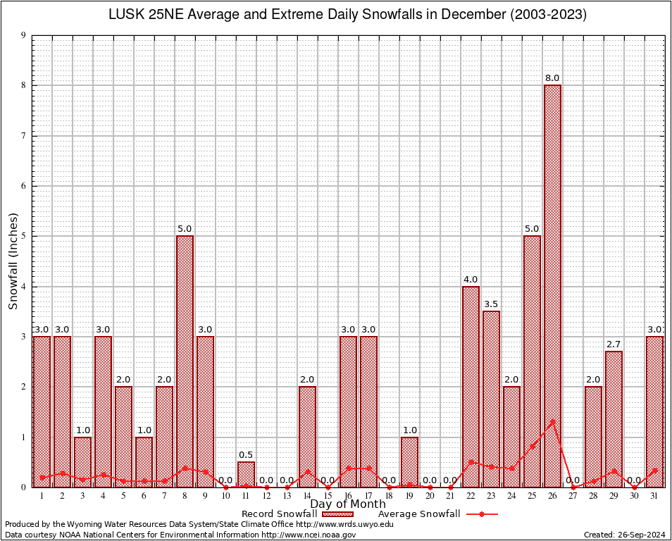 LUSK 25NE (485833) December Average and Extreme Daily Snowfall AMounts (2003-2023) To index page for LUSK 25NE
