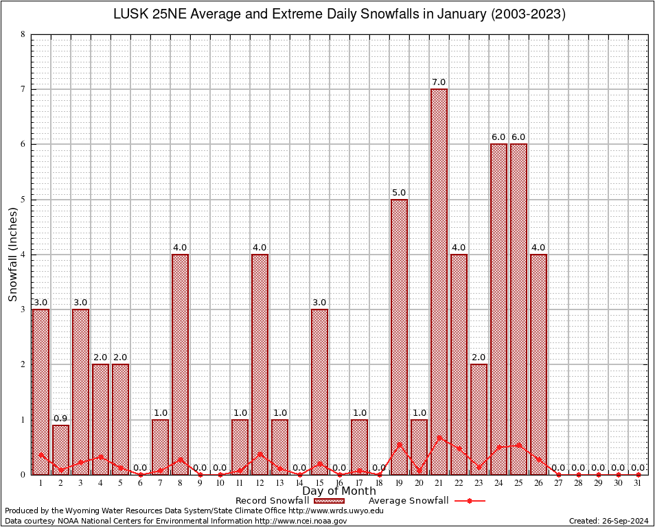 LUSK 25NE (485833) January Average and Extreme Daily Snowfall AMounts (2003-2023) To index page for LUSK 25NE