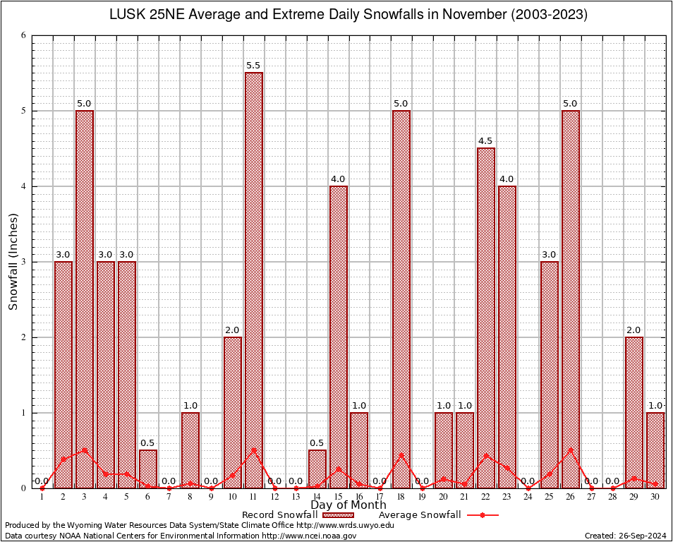 LUSK 25NE (485833) November Average and Extreme Daily Snowfall AMounts (2003-2023) To index page for LUSK 25NE