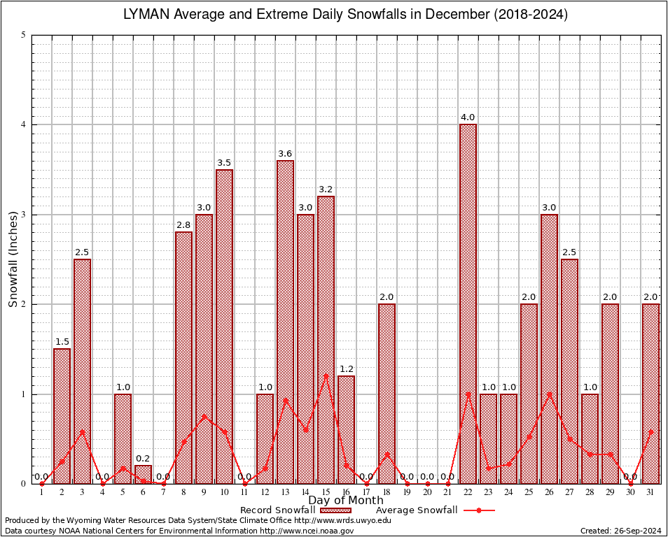 LYMAN (485839) December Average and Extreme Daily Snowfall AMounts (2018-2024) To index page for LYMAN