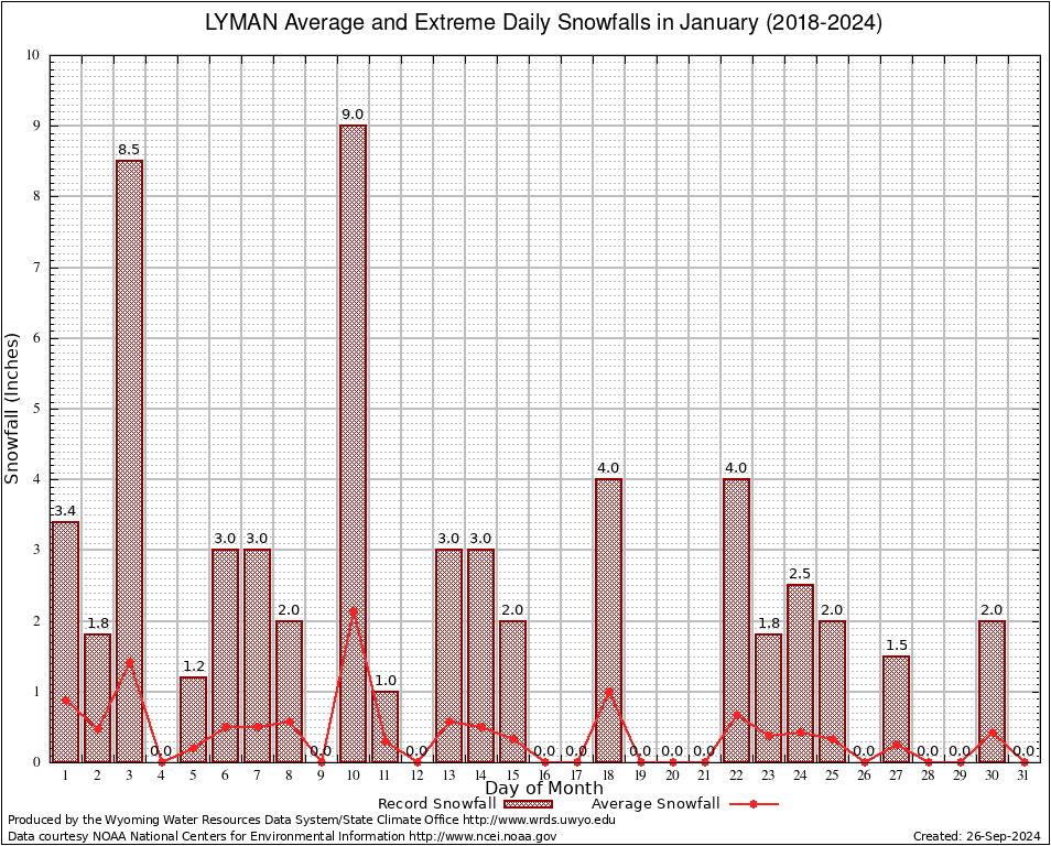 LYMAN (485839) January Average and Extreme Daily Snowfall AMounts (2018-2024) To index page for LYMAN