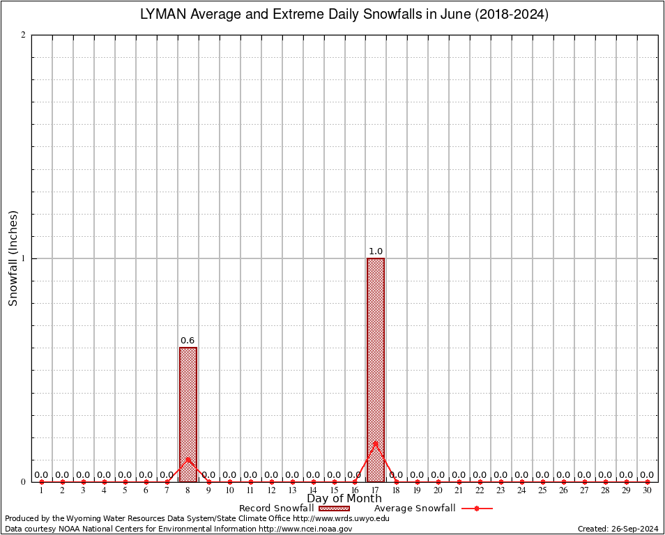 LYMAN (485839) June Average and Extreme Daily Snowfall AMounts (2018-2024) To index page for LYMAN