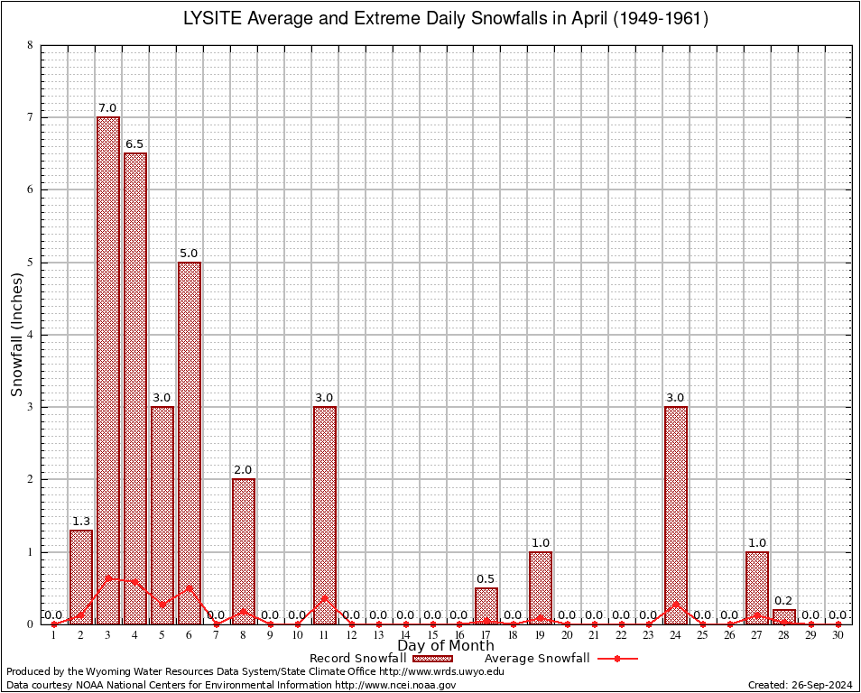 LYSITE (485843) April Average and Extreme Daily Snowfall AMounts (1949-1961) To index page for LYSITE