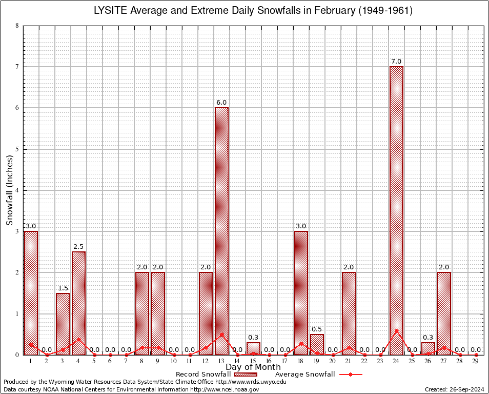 LYSITE (485843) February Average and Extreme Daily Snowfall AMounts (1949-1961) To index page for LYSITE
