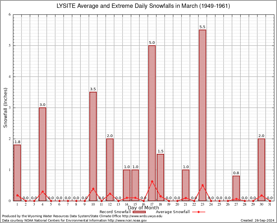 LYSITE (485843) March Average and Extreme Daily Snowfall AMounts (1949-1961) To index page for LYSITE