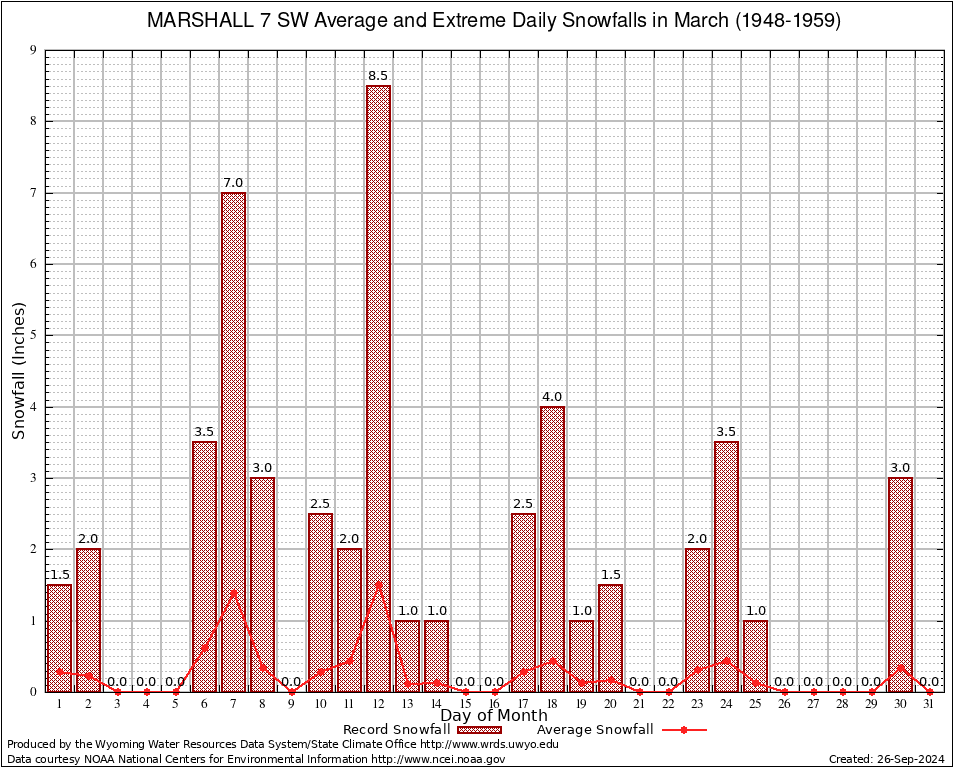 March Average and Extreme Daily Snowfall AMounts (1948-1959)