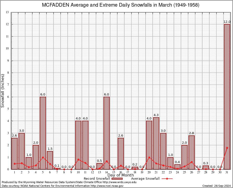 MCFADDEN (486081) March Average and Extreme Daily Snowfall AMounts (1949-1958) To index page for MCFADDEN