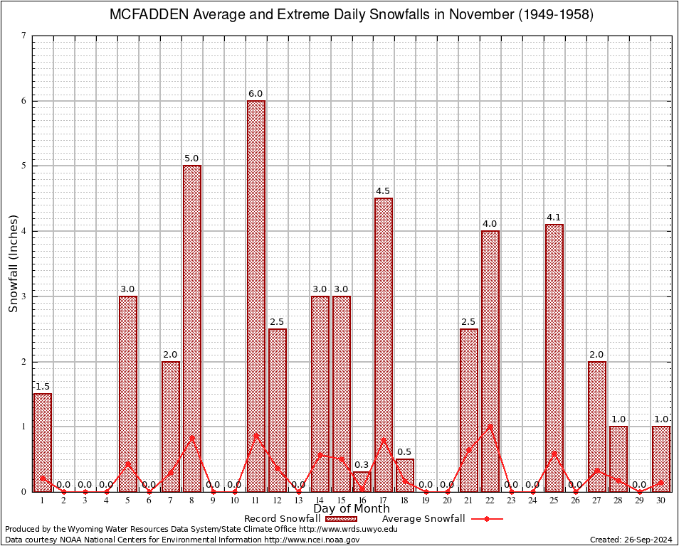MCFADDEN (486081) November Average and Extreme Daily Snowfall AMounts (1949-1958) To index page for MCFADDEN