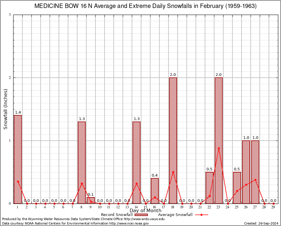 February Average and Extreme Daily Snowfall AMounts (1959-1963)