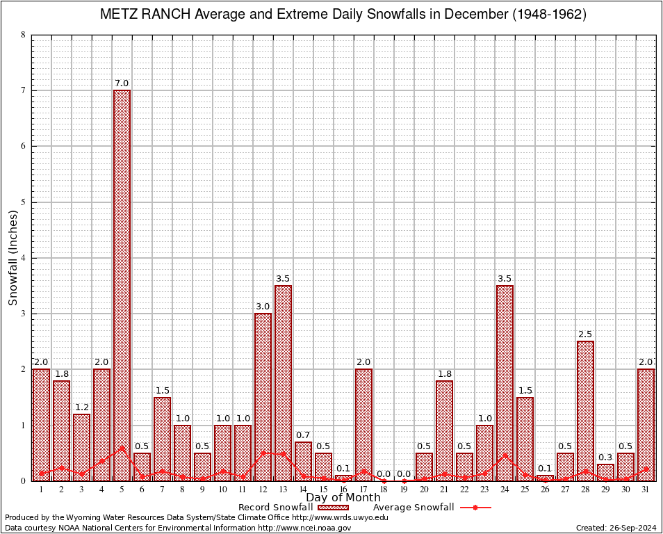 METZ RANCH (486175) December Average and Extreme Daily Snowfall AMounts (1948-1962) To index page for METZ RANCH