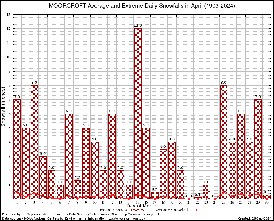 April Average and Extreme Daily Snowfall AMounts (1903-2024)