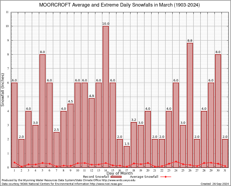 March Average and Extreme Daily Snowfall AMounts (1903-2024)