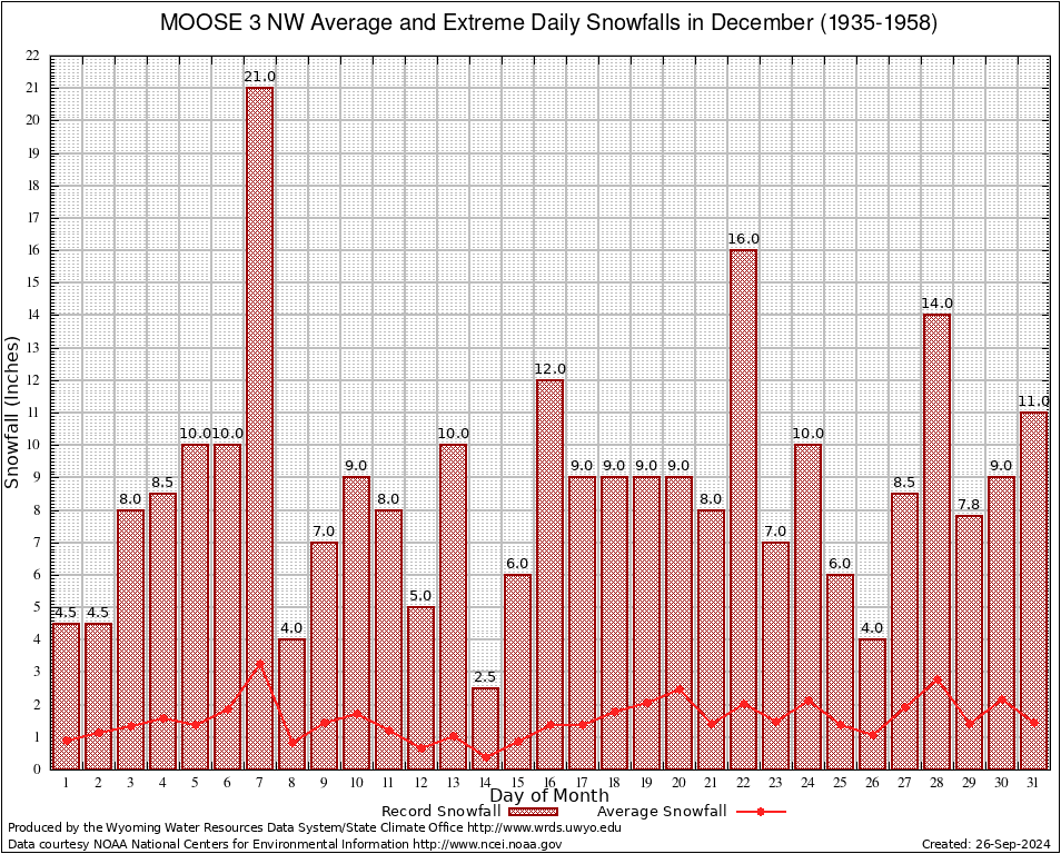 MOOSE 3 NW (486430) December Average and Extreme Daily Snowfall AMounts (1935-1958) To index page for MOOSE 3 NW