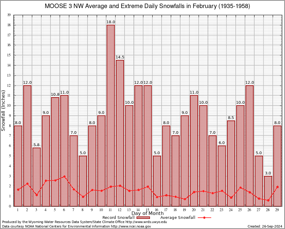 MOOSE 3 NW (486430) February Average and Extreme Daily Snowfall AMounts (1935-1958) To index page for MOOSE 3 NW