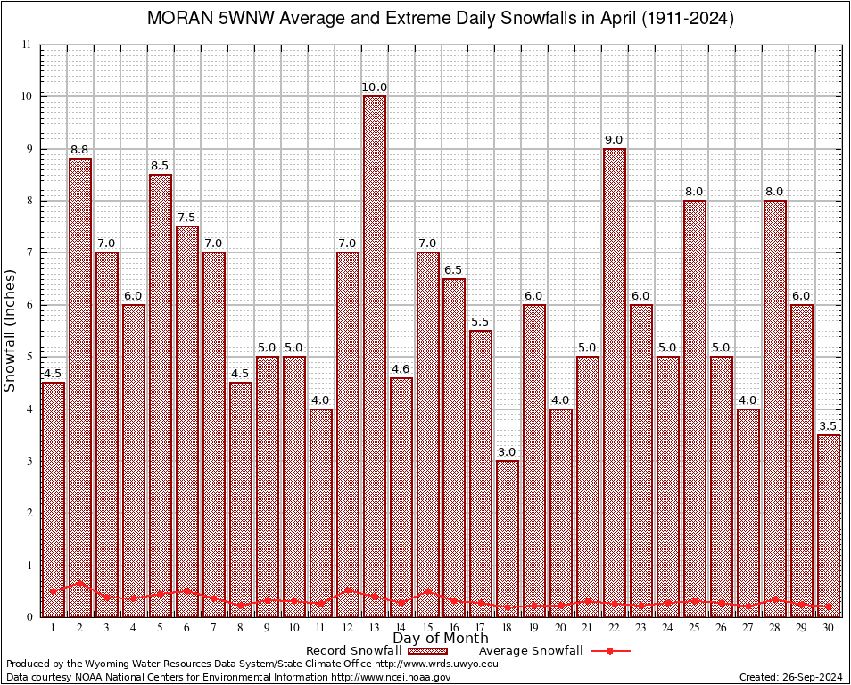 April Average and Extreme Daily Snowfall AMounts (1911-2024)