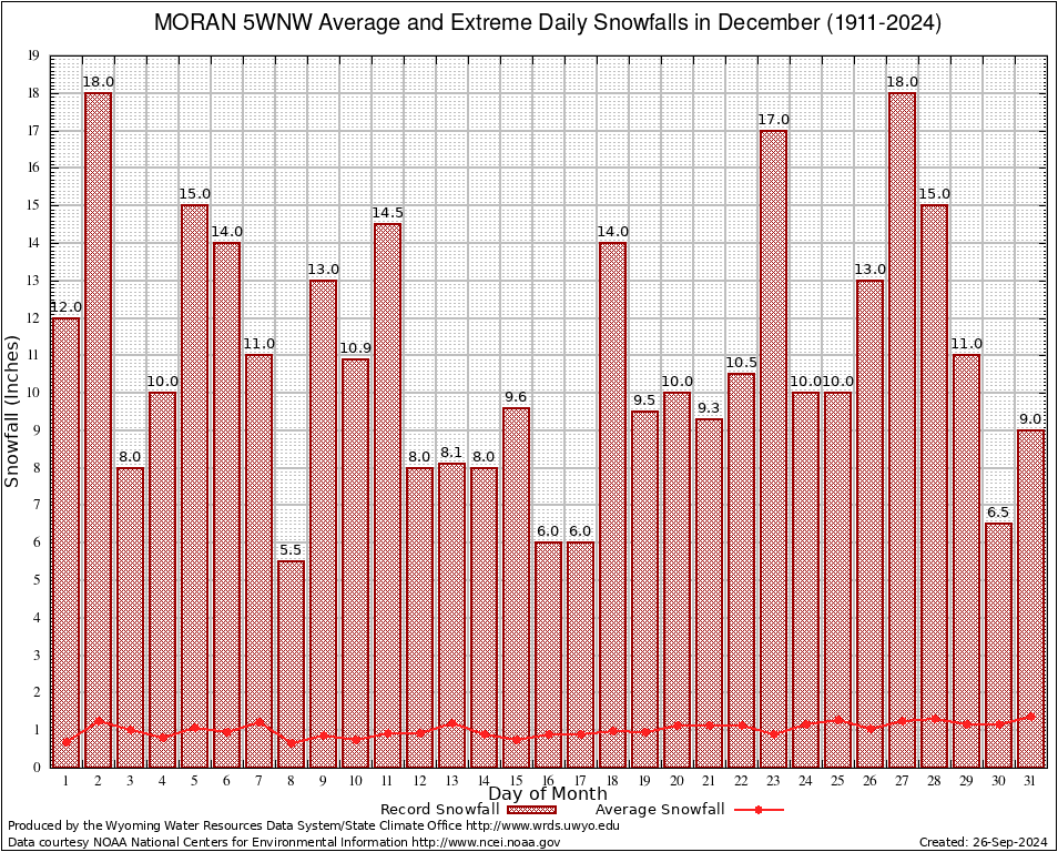 MORAN 5WNW (486440) December Average and Extreme Daily Snowfall AMounts (1911-2024) To index page for MORAN 5WNW