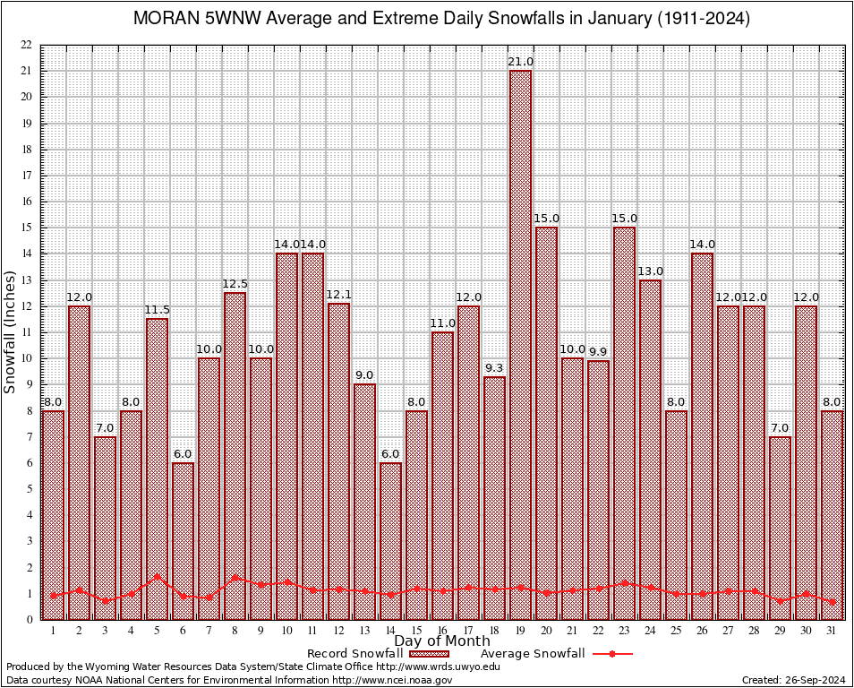 January Average and Extreme Daily Snowfall AMounts (1911-2024)