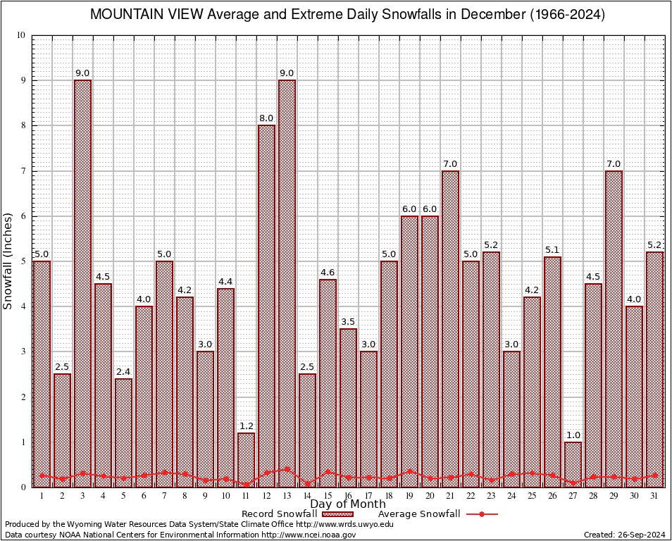 December Average and Extreme Daily Snowfall AMounts (1966-2024)