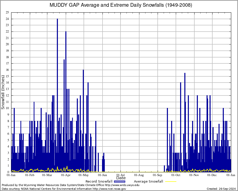 MUDDY GAP (486595) Annual Average and Extreme Daily Snowfall AMounts (1949-2008) To index page for MUDDY GAP