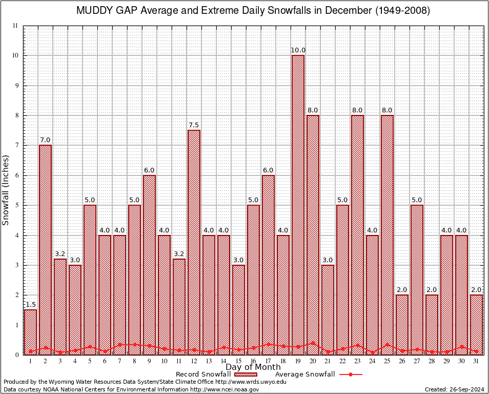 MUDDY GAP (486595) December Average and Extreme Daily Snowfall AMounts (1949-2008) To index page for MUDDY GAP