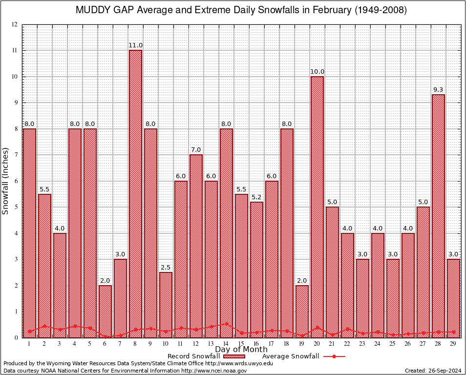 MUDDY GAP (486595) February Average and Extreme Daily Snowfall AMounts (1949-2008) To index page for MUDDY GAP