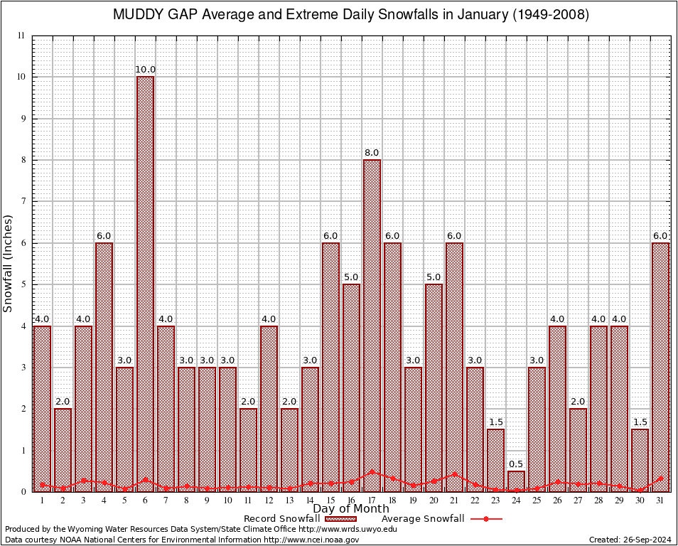 MUDDY GAP (486595) January Average and Extreme Daily Snowfall AMounts (1949-2008) To index page for MUDDY GAP