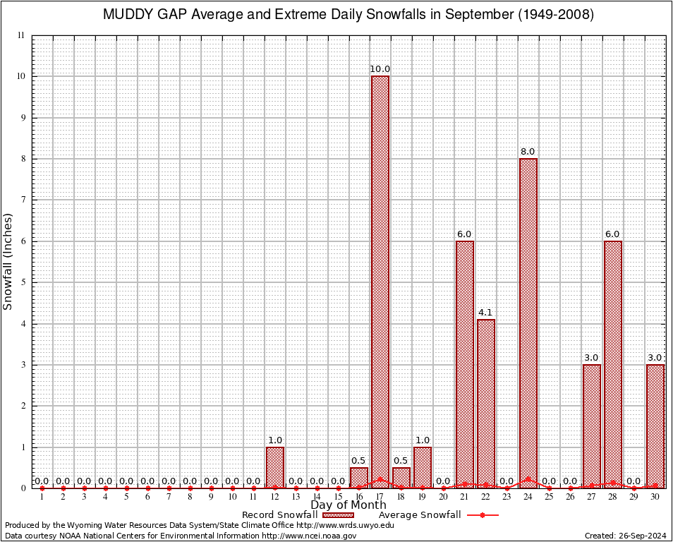 MUDDY GAP (486595) September Average and Extreme Daily Snowfall AMounts (1949-2008) To index page for MUDDY GAP