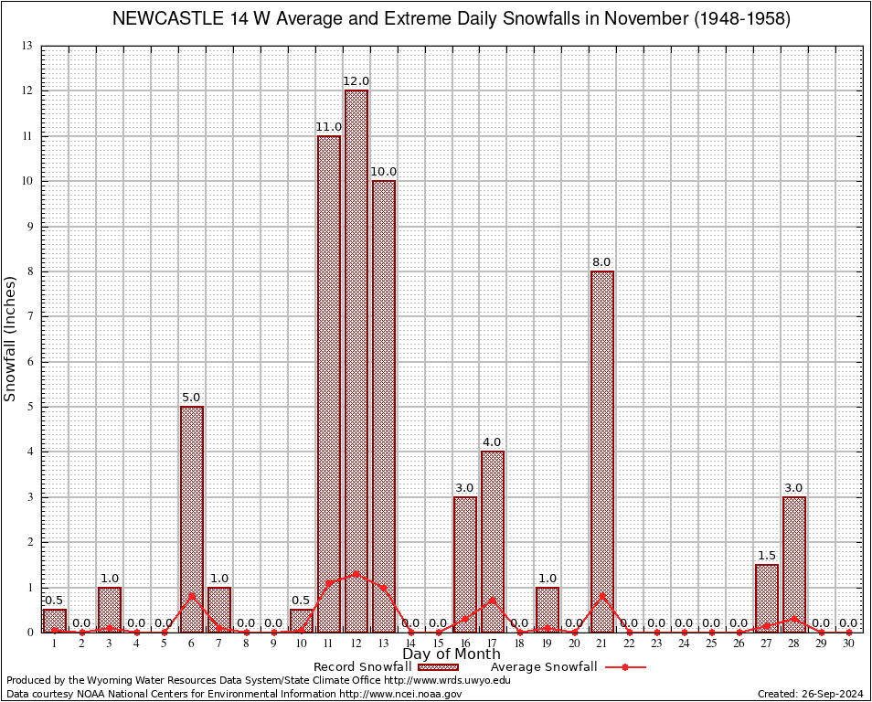 November Average and Extreme Daily Snowfall AMounts (1948-1958)