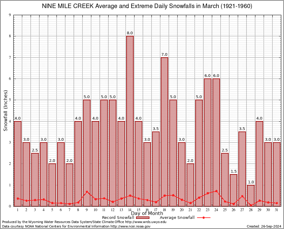 March Average and Extreme Daily Snowfall AMounts (1921-1960)