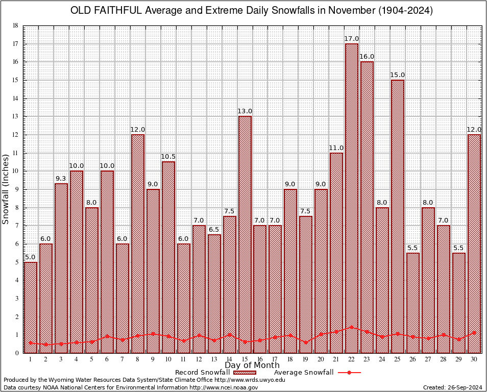November Average and Extreme Daily Snowfall AMounts (1904-2024)