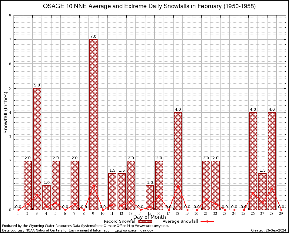 February Average and Extreme Daily Snowfall AMounts (1950-1958)