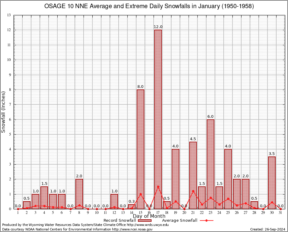 January Average and Extreme Daily Snowfall AMounts (1950-1958)