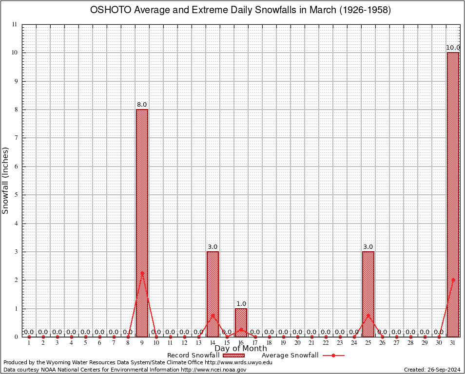 OSHOTO (486952) March Average and Extreme Daily Snowfall AMounts (1926-1958) To index page for OSHOTO