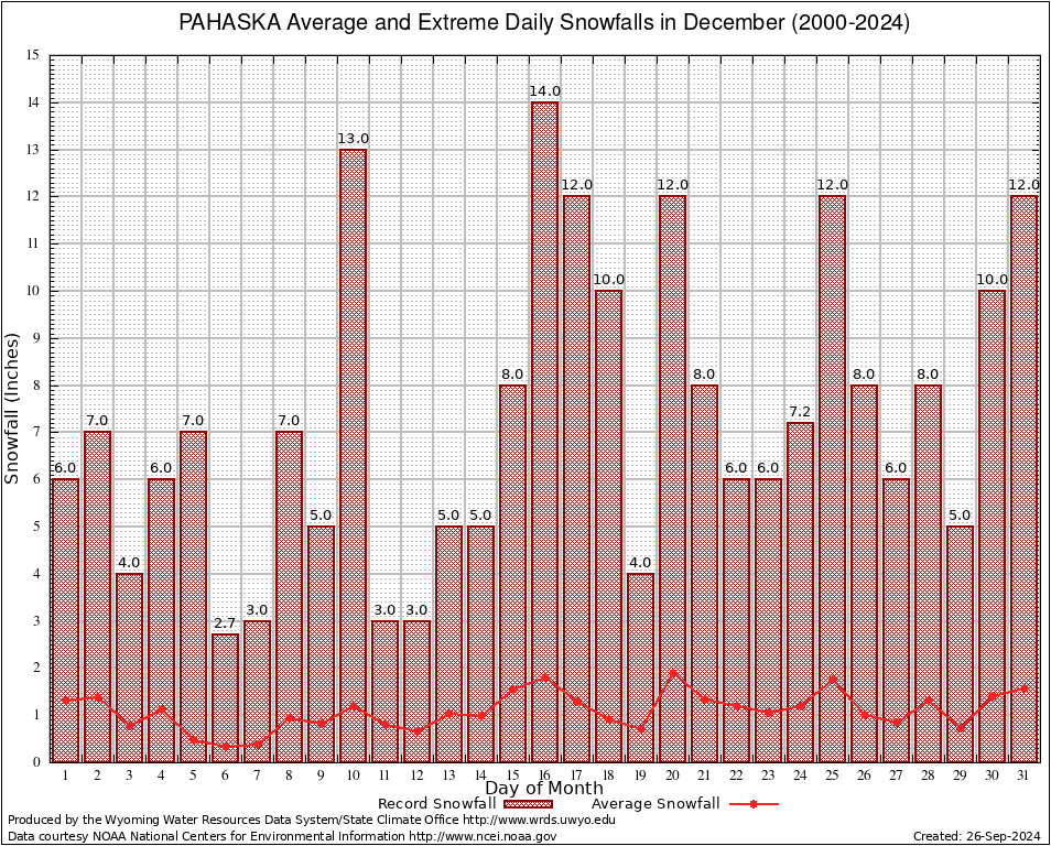 PAHASKA (487031) December Average and Extreme Daily Snowfall AMounts (2000-2024) To index page for PAHASKA