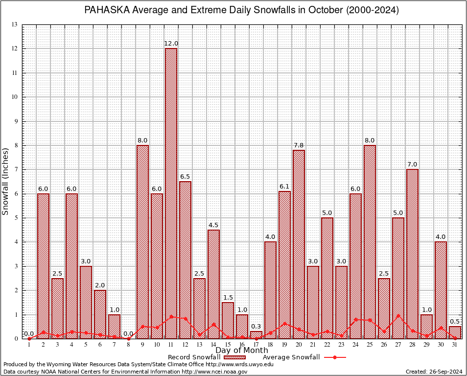 PAHASKA (487031) October Average and Extreme Daily Snowfall AMounts (2000-2024) To index page for PAHASKA