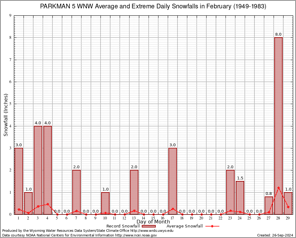 February Average and Extreme Daily Snowfall AMounts (1949-1983)