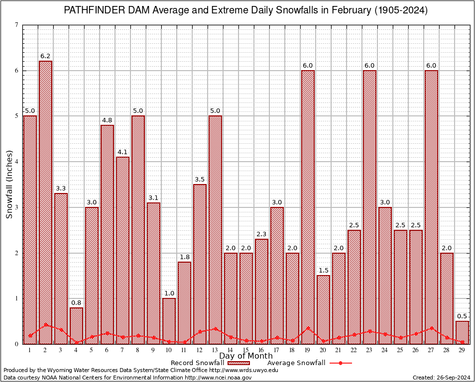 February Average and Extreme Daily Snowfall AMounts (1905-2024)