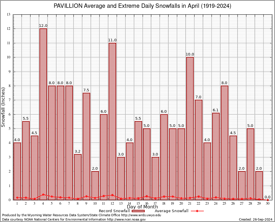 April Average and Extreme Daily Snowfall AMounts (1919-2024)