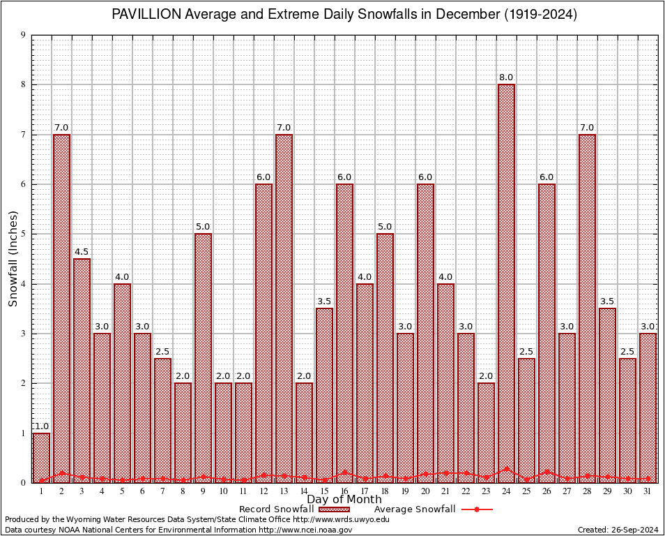 PAVILLION (487115) December Average and Extreme Daily Snowfall AMounts (1919-2024) To index page for PAVILLION